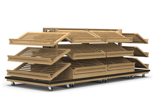 All around solid lumber construction with plastic bumper guards. Adjustable shelves feature built-in wooden price channel. Display has casters for easy movement and placement.