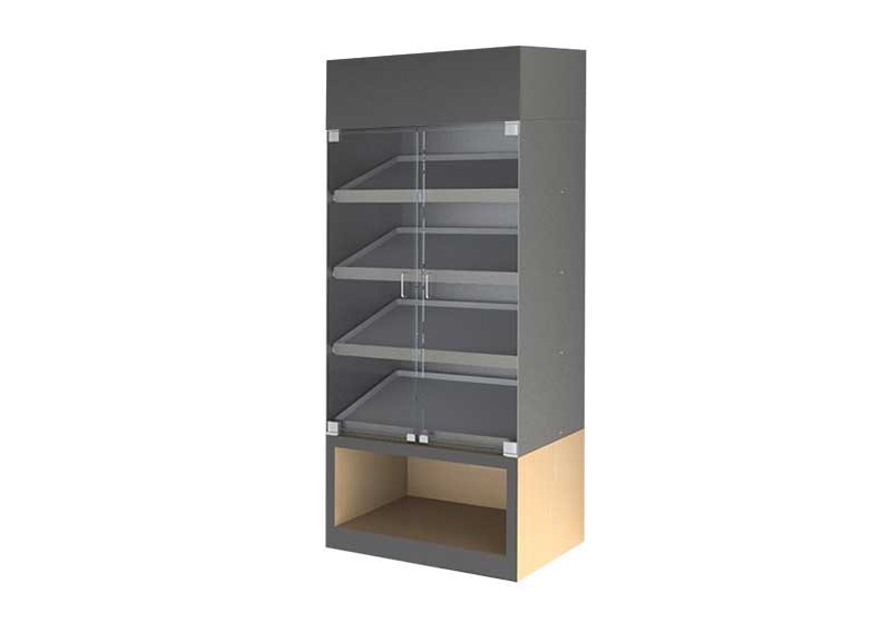 Metal encased display with 4 level shelves and 2 glass. Bottom space is great for cross merchandising.