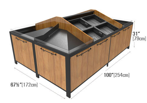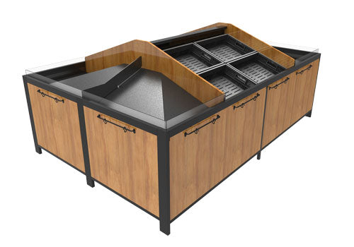 Great display for feature or ad items. Metal frame makes this a sturdy display all the way around. This display has compartments for RPCs and slanted risers. Optional price sign available. [100578209]