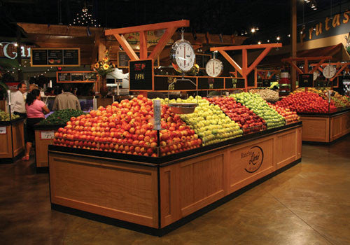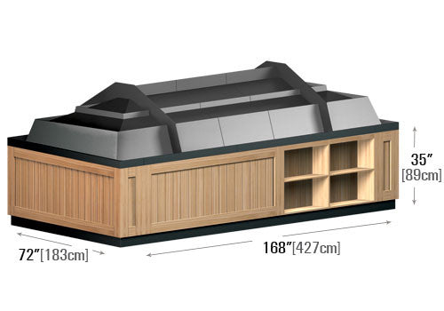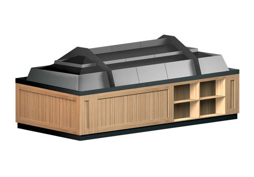Modular Dry Table featuring one side with an orchard frame and vertical decorative slats and the reverse side of each module comes standard with shadow box shelving. Custom logo available.
