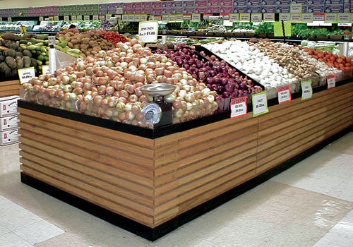 Modular Dry Table with horizontal slat sides is a modern, clean look for your department. Comes standard with shadow box shelving on the reverse side so you can cross merchandise as necessary.