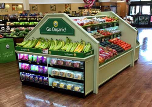 Organic table includes 2ft x 4ft center section and 2 different end caps. Material - oak or similar. Price tag channels on the lip of the shelves. Powder coated aluminum. Green finish. LED light underneath the shelves.