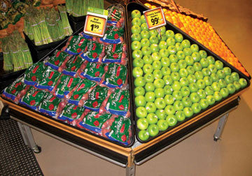 Triangular WEDGE euro table w/heavy duty casters. Solid metal construction. Fits 3 optional trays sitting side by side. Optional price tag available.
