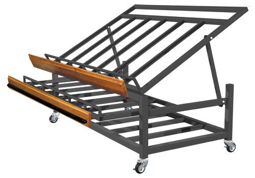 Versatile slant top table with metal construction, on casters. Available in 2 sizes: 48” or 72” [122 or 183cm] with different optional configurations. Available pull out drawer with or without wood fronts.