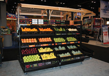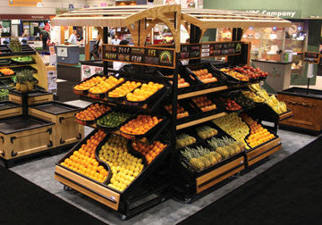 This versatile display is great for merchandising with boxes, RPC’s or chose to add some of our shelf trays for an enhanced presentation. The two upper shelves are adjustable (up and down) and can be set in a flat or angled position. The bottom shelf can be laid flat to hold a high volume of product or angled for a full look with minimal produce. The mobile display comes with casters that can be locked to hold it in place. Place this display against a wall or use the two sided version to create an island.