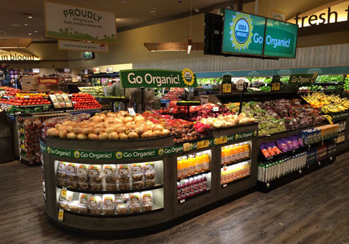 Round table with different 3 step risers. Built-in 2 level shelves with lighting for enhancing product visibility. Modular dry table with 24” and 36” midsections allowing room for expansion.