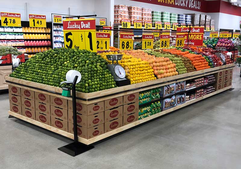 Use stackable apple boxes to create this an impressive table. Included is a 9" wood base and 3 level shelves for cross merchandising. Stadium style riser allows abundant look presentation with minimal produce.