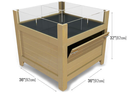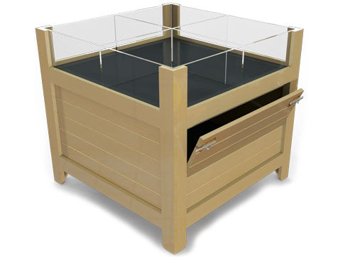 Contemporary and modern design bulk display with four compartments. High acrylic fence for great visibility of product. Storage for additional inventory.
