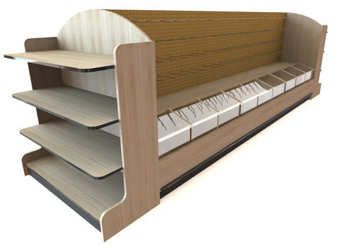 This bulk merchandising display fixture has the space for hanging packaged goods. Front bins are perfect for items like beans and rice. Included are four side shelves for cross merchandising.