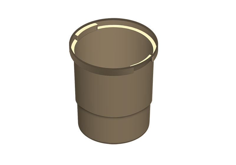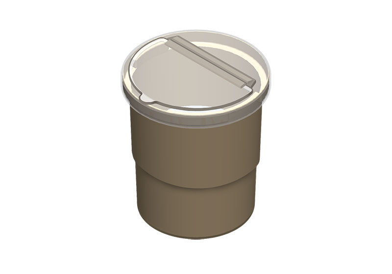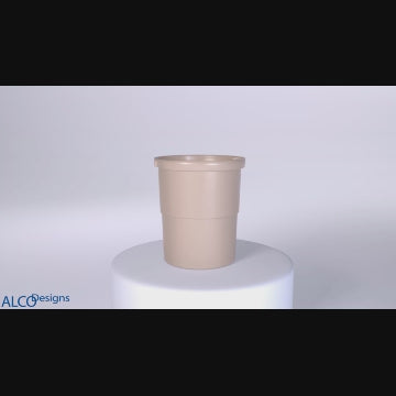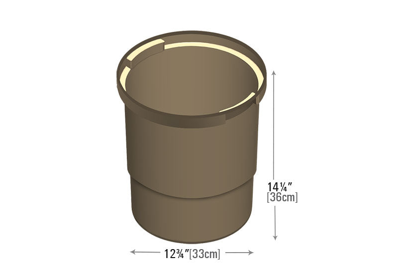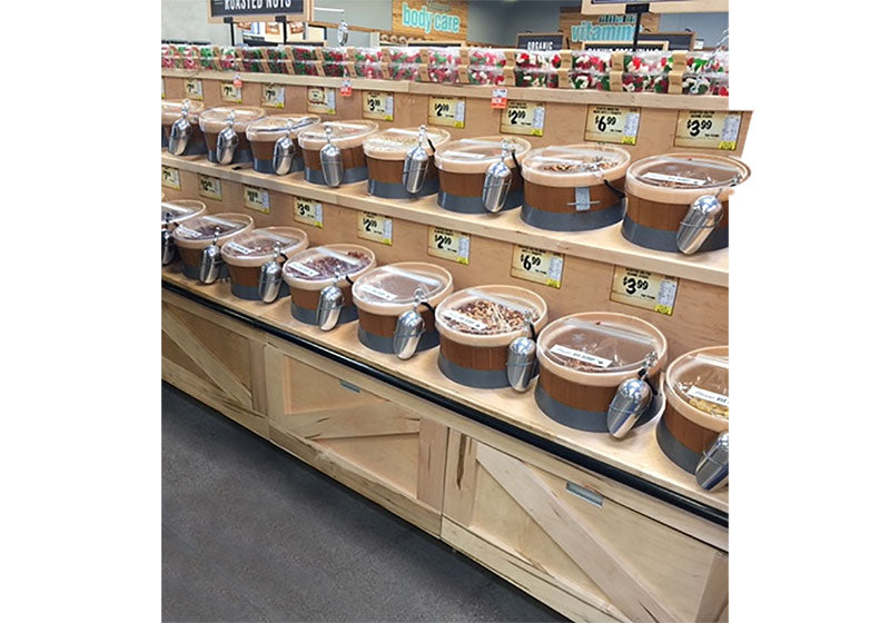 Optional plastic ring insert for bulk volume reduction. When combined with wood sleeve, bucket gives a faux barrel look. Molded handles on bucket provide easy lifting. Optional insert, lid and wired external scoop holder available.