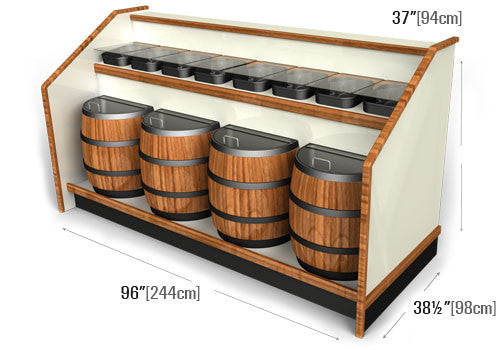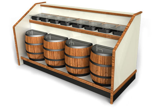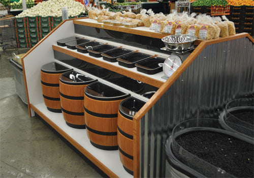 This floor display fixture has the space for a variety of your bulk items and keeps buckets & barrels in one place. Available in a wide variety of wood or laminate finishes to match your store decor.
