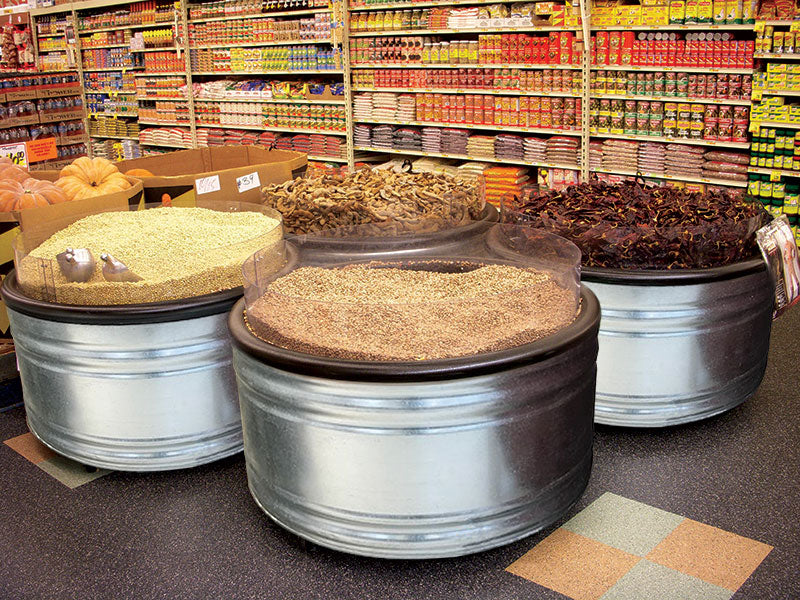 Functional and mobile, this bin comes with a 5”[13cm] deep ABS top and an underlying tray creating a double insulation. This keeps the galvanized bin from building condensation and better temperature retention. Bin comes with heavy casters. Includes clear fence, drain kit for wet or iced produce.