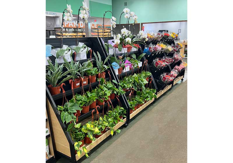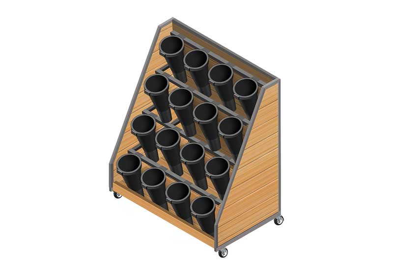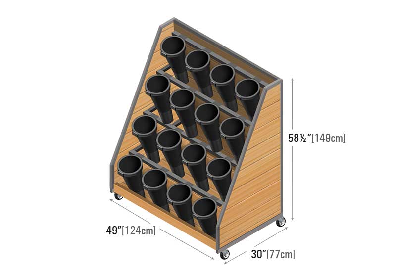 Metal frame floral display featuring outside wood siding. Removable flower buckets are held by a ring metal bracket, and the display is equipped with casters for easy mobility.