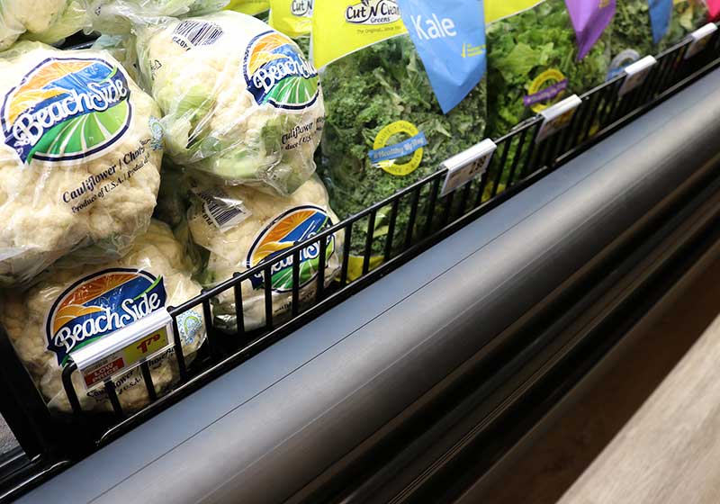 Vinyl coating prevents rusting, use on wet-rack, dry tables, deli and frozen cases. L-shaped with different heights on each side. Switch sides to accommodate high or low presentations.