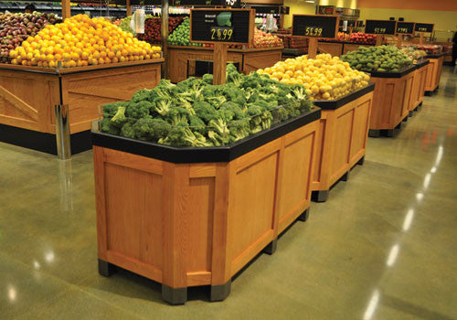 Like our classic orchard style produce bin only bigger! Built in divider allows you to merchandise two items on this impressive 6’ bin.
