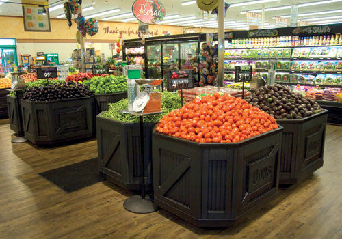 Bin top with 9” [23cm] high built-in pyramid riser. Gives a consistently high look without a lot of product.