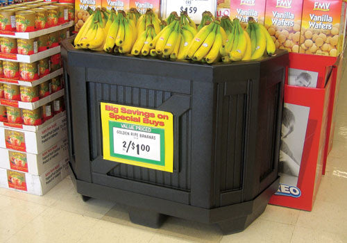 This easy to move half bin comes complete and is customized with your store logo. Great for wet rack or dry table spill-off displays.