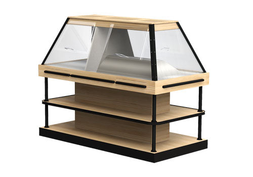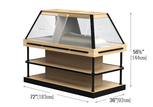 Perfect display for holding bolillos. Available two drawers for easy cleanout. Bottom two shelves for cross merchandising. Acrylic doors with “soft close” hinge.