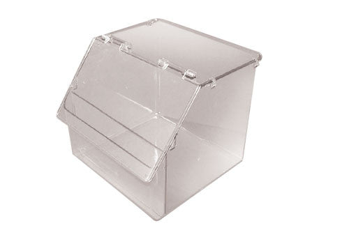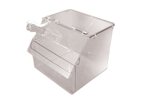 Increase impulse sales of bulk items with visible and available product. Removable front divider creates a false front so bin looks full. Hinged closing lid and tethered scoop or tongs with self contained holder.