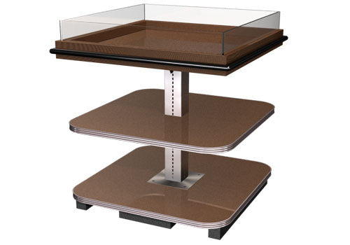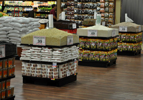 3 levels bulk merchandising display. Metal sides around shelves for protection. Pallet jack access for easy relocation.