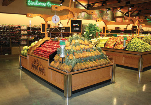 The low end cap on this Modular Dry Table allows for a dramatic and massive display of produce using little product. Custom logo available.