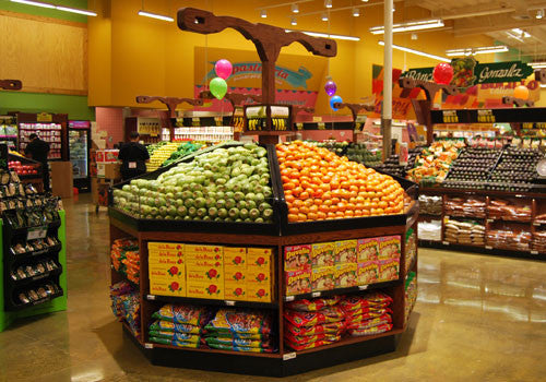 An octagon version of our DT800, this completely octagon table makes shopping easy from all angles. Contains eight compartments for cross merchandising. This compact and self contained dry table shown here with optional T wood holder and hanging scales (sold separately) will sure make a great addition for your produce department.