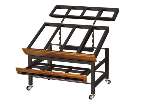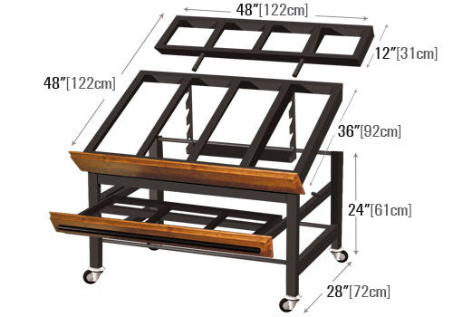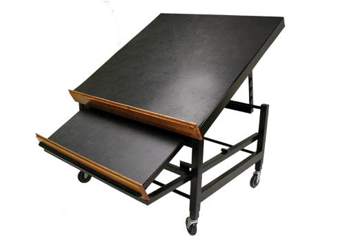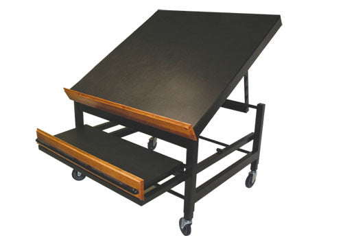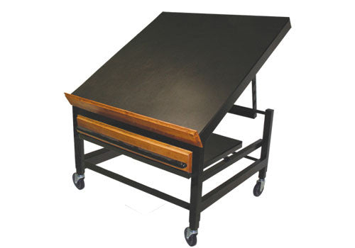 Adjustable table top with sliding drawer, wood fronts and bumper. Adjustable legs with casters. Removable 12”[31cm] extension converts this to a 36”[92cm] deep table. Pull out drawer has tilt top ability.