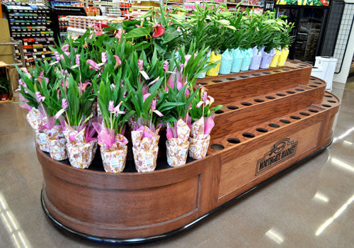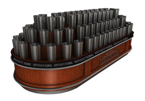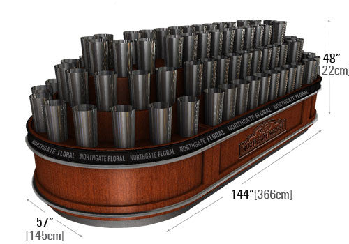 Spice up your floral department with this impressive round end floral display. Clean wood panels give this table a classic visual appeal like no other. Included are panels where this table can be converted into simple 3 level flat shelves. Holds 96 floral buckets. Customize this table to your store by adding a logo on side panels.