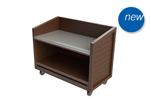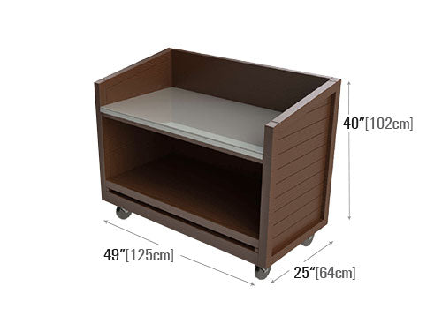 One sided two shelves bin with metal top shelf. Streamlined horizontal wood lines design for side and back panels.