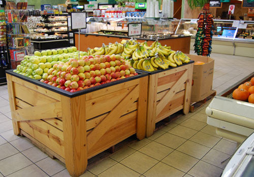 This Pine Orchard Bin has open pallet jack access at base for easy mobility. Outfitted with a 3”[8cm] deep liner to keep product in place. Optional dividers