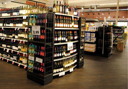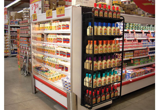 This double sided shelving unit hangs over the ends of refrigerated case and creates merchandising space.  Peg board backing and shelves give you merchandising flexibility. Adjustable for use with 2 door or 3 door cases.