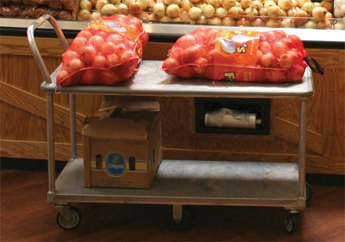 Four-wheeled stocking cart, great for stocking produce or general merchandise. Able to carry heavy loads. Available with or without Bumper.