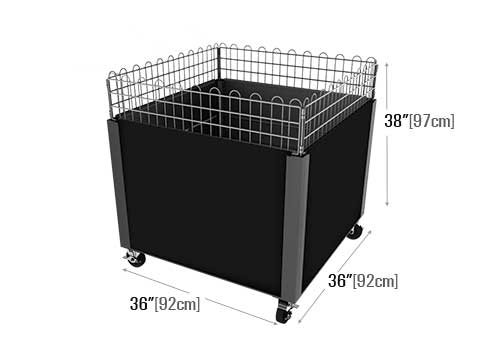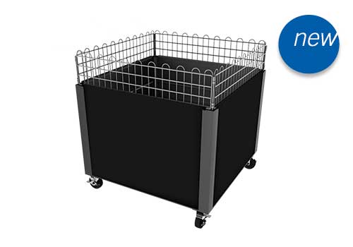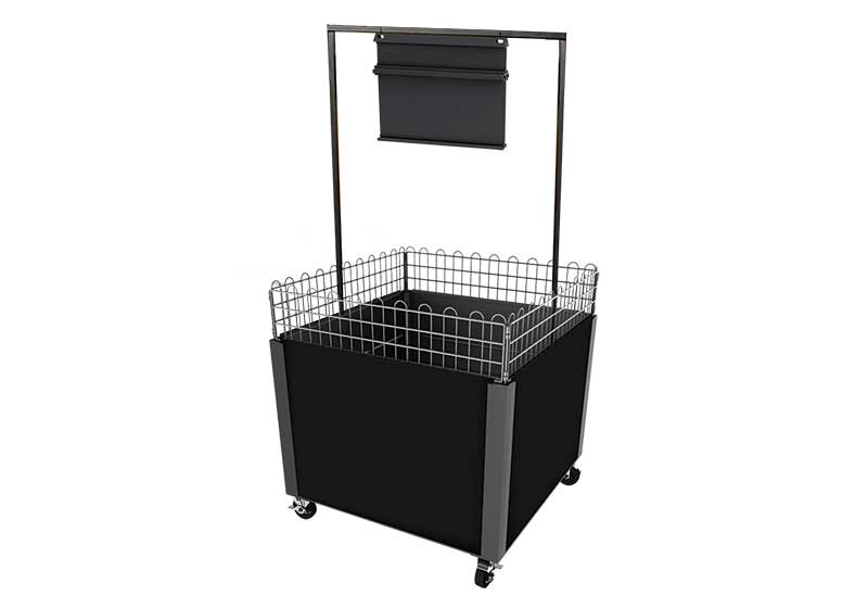 Solid metal frame with casters. Metal bin has adjustable shelf level. Removable graphic channel and wire fencing. Knocks down flat for reduced shipping cost.